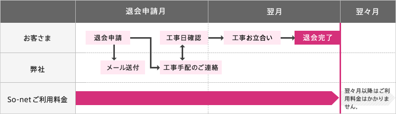 お客さまと弊社で取り決めさせていただく廃止工事月の月末の退会となります。