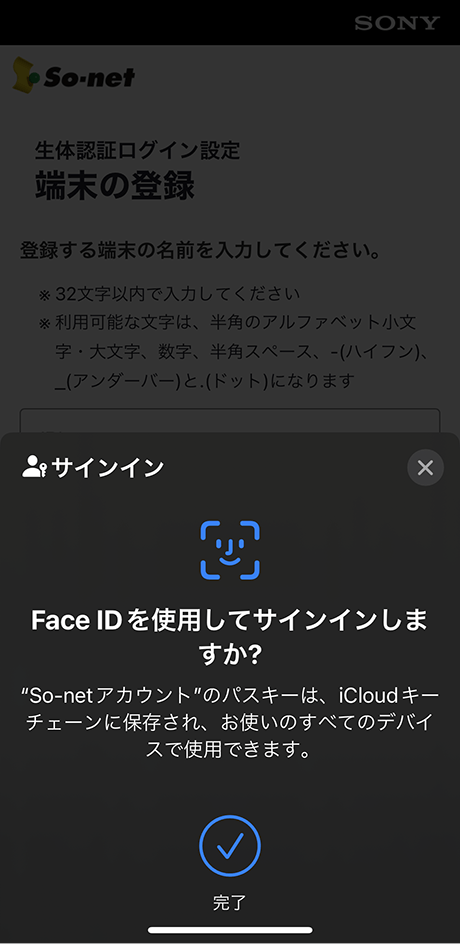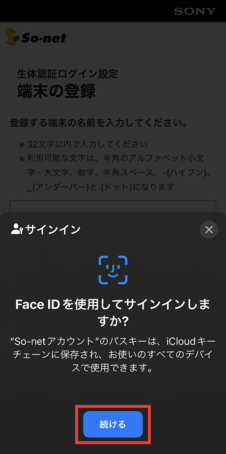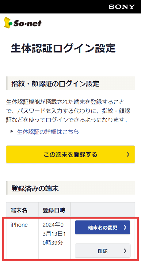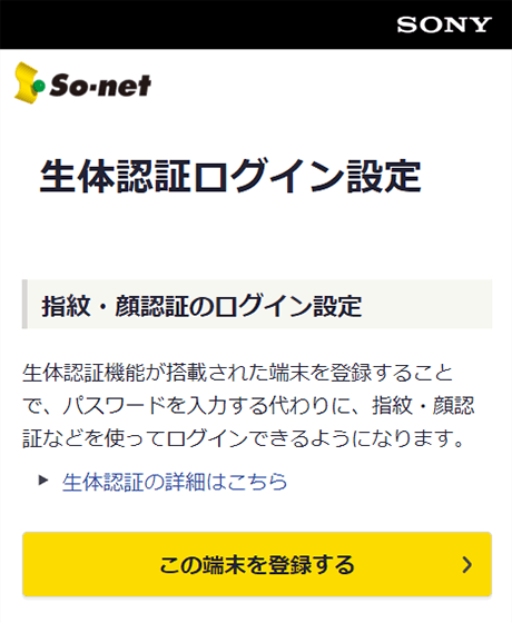 生体認証機能を持ったスマートフォンやタブレットをお持ちのお客さまは、その端末情報をSo-netに登録することで、パスワードを忘れてもSo-netにかんたんにログインすることができます。