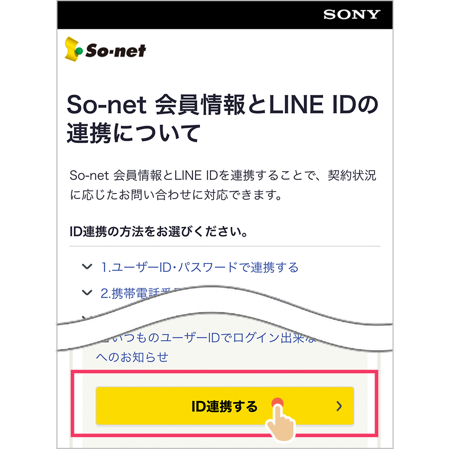 - ID連携後、So-net LINEサポートのご利用が一定期間ない場合、LINEからSo-net会員情報へのログインがタイムアウトとなり、再度ログインしていただく必要があります。