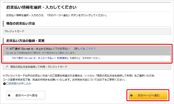 「お支払い情報の登録・変更」より「NTT請求(So-net 光・まとめて支払い)でのお支払い」を選択のうえ、「次のページへ進む」ボタンを押してください。