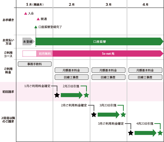 - ※開通月に口座振替の登録が完了した場合のご請求タイミングとなります。
